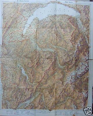 **Haute Savoie - High Savoy** Grande e interessante mappa geografica dei vasti territori montani o alpini rientranti nelle regioni svizzere dell'Alta Savoia, con anche parte del corrispondente confine italiano, con riportati innumerevoli toponimi relativi a piccole località o grandi paesi e città, oltre alla viabilità e alla conformazione geofisica del terriorio, con anche laghi e fiumi, *con visibile il magnifico Lago di Ginevra o Lac Leman, e le tante città tra cui la stessa Ginevra, e Carouge, Bonneville, Aubonne, St. Claude, Monthey, Montreux, Losanna, Morges, Nyon, Bex, St. Maurice, Martigny, Annecy e il suo lago, Chambery, Albertville, Seez, Moutiers, Chamonix,....* Mappa edita dall'Ist. Geografico di Kummerly & Frey (Berne), a cura di J. Frey Lousanne-Paris, Libr. Payot, s.d. (primo '900 circa); grandi belle dimensioni, misura cm. 81x67 (l'intero foglio, compresi i margini bianchi irregolari o diseguali) *Presente ancora la copertina originale, con su quella anteriore anche una bella illustrazione di paesaggio montano o alpino, eseguita in stampa litografica e firmata con monogramma dell'artista Gst (?)* ** Di interesse geografico decorativo e collezionistico Modesta conservazione generale, segni e difetti d'uso e d'epoca, inevitabili numerose piegature indispensabili per poter rendere la mappa tascabile, usura con rottura ad alcune piegature o angoli con anche minime mancanze, sparse fioriture o macchie, esemplare meritevole di eventuale restauro o almeno di essere inserito sotto passpartout ed incorniciato. *(le immagini allegate raffigurano particolari dell'intero foglio)*