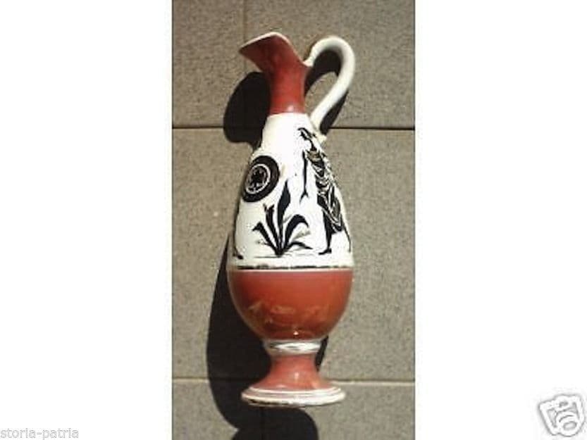 Pregevole ed interessante bottiglia da liquore in ceramica, con inusuale decorazione a motivi mitologici e classicheggianti, con due figure femminili ed al centro un soldato romano, prodotta dalla nota fabbrica Marmaca nella **Repubblica di San Marino**  **Tipico marchio presente sul fondo della base; cm.29 (altezza); buona conservazione generale, qualche traccia d'uso, manico reincollato all'attaccatura per vecchia rottura, facilmente meglio restaurabile.** Oggetto di bell'effetto decorativo di grande eleganza per la raffinata **laminatura in oro** che mette meglio in evidenza i contorni e le figure, di interesse collezionistico per le varie tematiche collegate. Guardate le altre mie aste!!