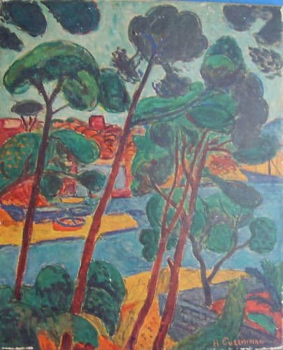 Hans Purrmann "Pini" Interessante e decorativa veduta d'epoca, bella stampa a colori con raffigurato un dipinto paesaggistico (intitolato Pini) del noto artista nativo di Montagnola (nei pressi di Lugano, ivi nato nel 1880), con studi a Karlsruhe e a Monaco e poi viaggio a Parigi dove strinse amicizia con alcuni impressionisti tra cui in particolare Henri Matisse, con cui fondò pure una scuola di pittura; nel 1935 diresse Villa Romana a Firenze; passo i suoi ultimi anni nella città natìa (Montagnola); *ben si apprezza in questa raffigurazione l' influenza esercitata dal Matisse sul Purrmann;* stampa a colori impressa su carta con sistema tipo offset, e incollata in origine su tela con telaio in legno, utile per essere incorniciata a guisa di un dipinto; al verso, incollate sul telaio ligneo, sono due targhette di cui una illegibile in lingua tedesca (?) e altra -multilingue- con i riferimenti bibliografici e catalografici dell'opera raffigurata; misura circa cm. 46x38; senza data, ma databile presumibilmente alla metà del '900 (?) RO)nzGpBMY7+0h1TQ~~_35.JPG) Ou2okCiBMY7+6tD5Q~~_35.JPG) Di interesse artistico, collezionistico, decorativo Discreta conservazione generale, segni e difetti d'uso e d'epoca, sparse abrasioni e spellature o difetti vari marginali, erosioni da tarme o abrasioni alle targhette cartacee posteriori firma impressa a stampa in basso a destra, **meritevole di essere inserita sotto passpartout ed incorniciata**.