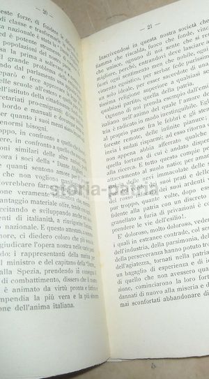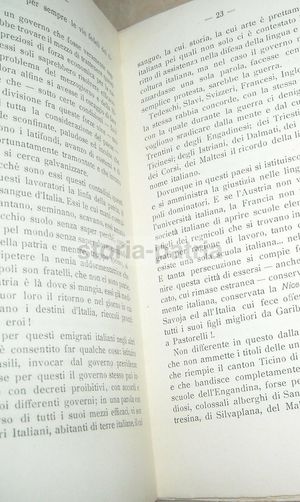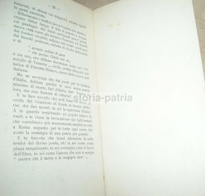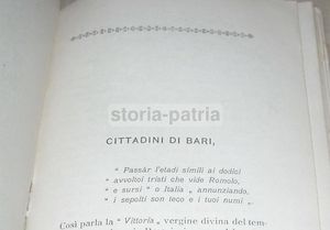 Rara edizione d'epoca, pubblicazione patrocinata dal Comitato barese della Società Dante Alighieri. Il testo contiene la dissertazione di carattere patriottico tenuta dal Dr. Scotti e indirizzata alla cittadinanza di Bari. L'opera include riferimenti storici alla Vittoria del tempio di Vespasiano in Brescia, a Federico II e Manfredi, oltre a figure chiave del Risorgimento come Mazzini e Garibaldi.