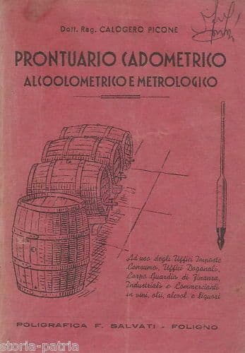Calogero Picone Prontuario cadometrico *alcolometrico e metrologico* *...* Foligno, Salvati, 1952 Cm. 15, pp.196, bross. edit. (sciupata) [](https://it.wikipedia.org/wiki/Homo_sapiens_sapiens "Homo sapiens sapiens") Interessante edizione d'epoca, a cura del Picone, probabilmente all'epoca funzionario delle Imposte di Consumo della cittadina di Foligno (Umbria), manuale ad uso di operatori del settore di controllo e per industriali e commercianti in prodotti vinicoli o olii e liquori, utile pubblicazione con all'interno capitoli inerenti *Imposte di consumo* *Bevande* *Produzione vinicola in Italia* *Misurazione dei liquidi* *Suggellazione dei recipienti* *Misurazione del volume dei fusti* *Fusti regolari e irregolari e scemi* *Tini, pozzi, vasche, cisterne, caldaie, ...e loro misurazione* *Determinazione della gradazione alcolica dei vini con l'ebulliometro* *Alcolometro centesimale di Gay-Lussac* *Determinazione della forza alcolica dei liquidi* *Sistema metrico decimale, peso specifico, tara delle principali merci* *Ragguaglio pesi e misure delle diverse regioni d'Italia, e di tutti i paesi del mondo* *.....* *con alcune figure illustrative nel testo, tra cui l'ebulliometro di Malligand, immagini di fusti irregolari,...* Di interesse specialistico, agrario, vinicolo, chimico, scientifico, bibliografico, storico-locale Discreta conservazione generale, segni e difetti d'uso e d'epoca, sgualciture macchie e difetti vari alle copertine e al dorso della brossura, fioriture diffuse e sgualciture marginali, firma exlibris in copertina e al frontespizio.