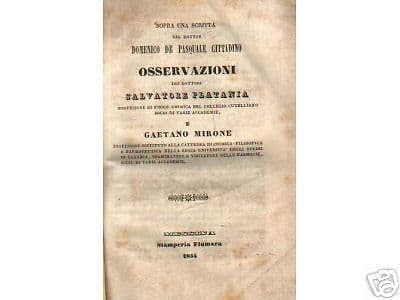 Platania Salvatore – Mirone Gaetano Sopra una scritta del dottor Domenico De Pasquale cittadino *Osservazioni* Messina, Fiumara, 1844. Cm.18,5; pp.60; senza legatura. Interessante antica e rara edizione originale e d'epoca, gustosa dissertazione specialistica scientifica, chimico-medico-farmaceutica, edita per confutare le opinioni in tema di farmacia espresse dal dottor De Pasquale. Di interesse scientifico specialistico storico-locale siciliano e bibliografico Buona conservazione generale, segni e difetti d'uso o d'epoca, fioriture sparse, senza legatura o copertine e pertanto meritevole di rilegatura.