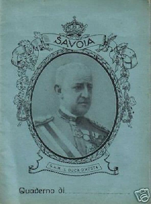 Savoia S.A.R. il Duca d'Aosta Bella raffigurazione del noto personaggio di Casa Savoia, in una artistica cornice allegorica, copertina di un quaderno scolastico, a righe, mai usato, con anche sulla copertina posteriore una tavola pitagorica. Cm.19,5; s.d. (circa anni '30 ?) Di interesse collezionistico Buona conservazione generale, usuali segni d'uso o d'epoca.