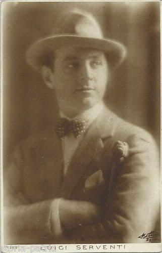 Luigi Serventi Interessante antica e rara cartolina originale, raffigurante il noto attore e regista romano, in una affascinate posa fotografica; cartolina d'epoca, misura circa cm.9x14; ediz. Bettini (Roma), mai usata nè viaggiata per posta; databile alla prima metà del '900. Di interesse cinematografico, fotografico, storico-locale, collezionistico Buona conservazione generale, segni e difetti d'uso e d'epoca, sparse fioriture o difetti vari marginali, ***meritevole anche di essere inserita sotto passpartout ed incorniciata.*** ***#####*** * Luigi Serventi, detto anche Gigi ([Roma](https://it.wikipedia.org/wiki/Roma "Roma"), [31 luglio](https://it.wikipedia.org/wiki/31_luglio "31 luglio") [1885](https://it.wikipedia.org/wiki/1885 "1885") – [Roma](https://it.wikipedia.org/wiki/Roma "Roma"), [18 agosto](https://it.wikipedia.org/wiki/18_agosto "18 agosto") [1976](https://it.wikipedia.org/wiki/1976 "1976")), è stato un [attore](https://it.wikipedia.org/wiki/Attore "Attore") e [regista](https://it.wikipedia.org/wiki/Regista "Regista") [italiano](https://it.wikipedia.org/wiki/Italia "Italia"). Proveniente da una famiglia del [ceto borghese](https://it.wikipedia.org/wiki/Borghesia "Borghesia") romano, si avvicinò al [teatro](https://it.wikipedia.org/wiki/Teatro "Teatro") nel [1911](https://it.wikipedia.org/wiki/1911 "1911") ed entrò a far parte della [compagnia teatrale](https://it.wikipedia.org/wiki/Compagnia_teatrale "Compagnia teatrale") di [Vittoria Lepanto](https://it.wikipedia.org/wiki/Vittoria_Lepanto "Vittoria Lepanto"). Fu poi nella compagnia di [Ermete Novelli](https://it.wikipedia.org/wiki/Ermete_Novelli "Ermete Novelli") e in quella di [Ettore Berti](https://it.wikipedia.org/w/index.php?title=Ettore_Berti&action=edit&redlink=1 "Ettore Berti (pagina inesistente)"). Abbandonò il teatro nel [1913](https://it.wikipedia.org/wiki/1913 "1913") per dedicarsi all'attività cinematografica, e lo fece presso la *[Latium Film](https://it.wikipedia.org/wiki/Latium_Film "Latium Film")* scritturato come [«comparsa»](https://it.wikipedia.org/wiki/Comparsa_\(cinema\) "Comparsa (cinema)"). Successivamente passò ad altre case cinematografiche, tra queste, la *[Pasquali Film](https://it.wikipedia.org/wiki/Pasquali_Film "Pasquali Film")*, la *[Cines](https://it.wikipedia.org/wiki/Cines "Cines")*, la *[Milano Films](https://it.wikipedia.org/wiki/Milano_Films "Milano Films")*, l'*[Itala Film](https://it.wikipedia.org/wiki/Itala_Film "Itala Film")* etc.. Protagonista in film di successo come *Il vetturale del Moncenisio* ([1916](https://it.wikipedia.org/wiki/1916 "1916")), *Il Re, le Torri e gli Alfieri* ([1917](https://it.wikipedia.org/wiki/1917 "1917")), *Il padrone delle ferriere* ([1919](https://it.wikipedia.org/wiki/1919 "1919")) ed *Il romanzo di un giovane povero* ([1920](https://it.wikipedia.org/wiki/1920 "1920")), Serventi si affermò come uno dei maggiori *[divi](https://it.wikipedia.org/wiki/Divismo "Divismo")* maschili del [cinema italiano](https://it.wikipedia.org/wiki/Cinema_italiano "Cinema italiano") del periodo [muto](https://it.wikipedia.org/wiki/Cinema_muto "Cinema muto"). Specializzato soprattutto in ruoli da romantico, in molti film recitò accanto ad alcune tra le più famose *dive* femminili dell'epoca come [Bianca Virginia Camagni](https://it.wikipedia.org/w/index.php?title=Bianca_Virginia_Camagni&action=edit&redlink=1 "Bianca Virginia Camagni (pagina inesistente)"), [Leda Gys](https://it.wikipedia.org/wiki/Leda_Gys "Leda Gys"), [Hesperia](https://it.wikipedia.org/wiki/Hesperia_\(attrice\) "Hesperia (attrice)") e [Pina Menichelli](https://it.wikipedia.org/wiki/Pina_Menichelli "Pina Menichelli"). Nel [1923](https://it.wikipedia.org/wiki/1923 "1923") Serventi emigrò in [Germania](https://it.wikipedia.org/wiki/Germania "Germania"), paese nel quale riscosse il medesimo successo di pubblico avuto in patria, ed apparve in numerose pellicole. Fu attore anche in [Cecoslovacchia](https://it.wikipedia.org/wiki/Cecoslovacchia "Cecoslovacchia") e in [Austria](https://it.wikipedia.org/wiki/Austria "Austria"). Tuttavia, in quel periodo Serventi venne chiamato a interpretare alcuni film in Italia come *Voglio tradire mio marito* ([1925](https://it.wikipedia.org/wiki/1925 "1925")), *Il gigante delle Dolomiti* ([1927](https://it.wikipedia.org/wiki/1927 "1927")) e *Il cantastorie di Venezia* ([1929](https://it.wikipedia.org/wiki/1929 "1929")). Nel [cinema sonoro](https://it.wikipedia.org/wiki/Cinema_sonoro "Cinema sonoro"), la carriera di Serventi stentò a proseguire, e l'ultima vera interpretazione fu in *Montagne in fiamme* del [1931](https://it.wikipedia.org/wiki/1931 "1931"). In quello stesso anno, l'attore si stabilì a [Kitzbühel](https://it.wikipedia.org/wiki/Kitzb%C3%BChel "Kitzbühel"), città dove visse per lunghi anni prima di ritornare molto anziano in Italia.(dal web, wiki) *