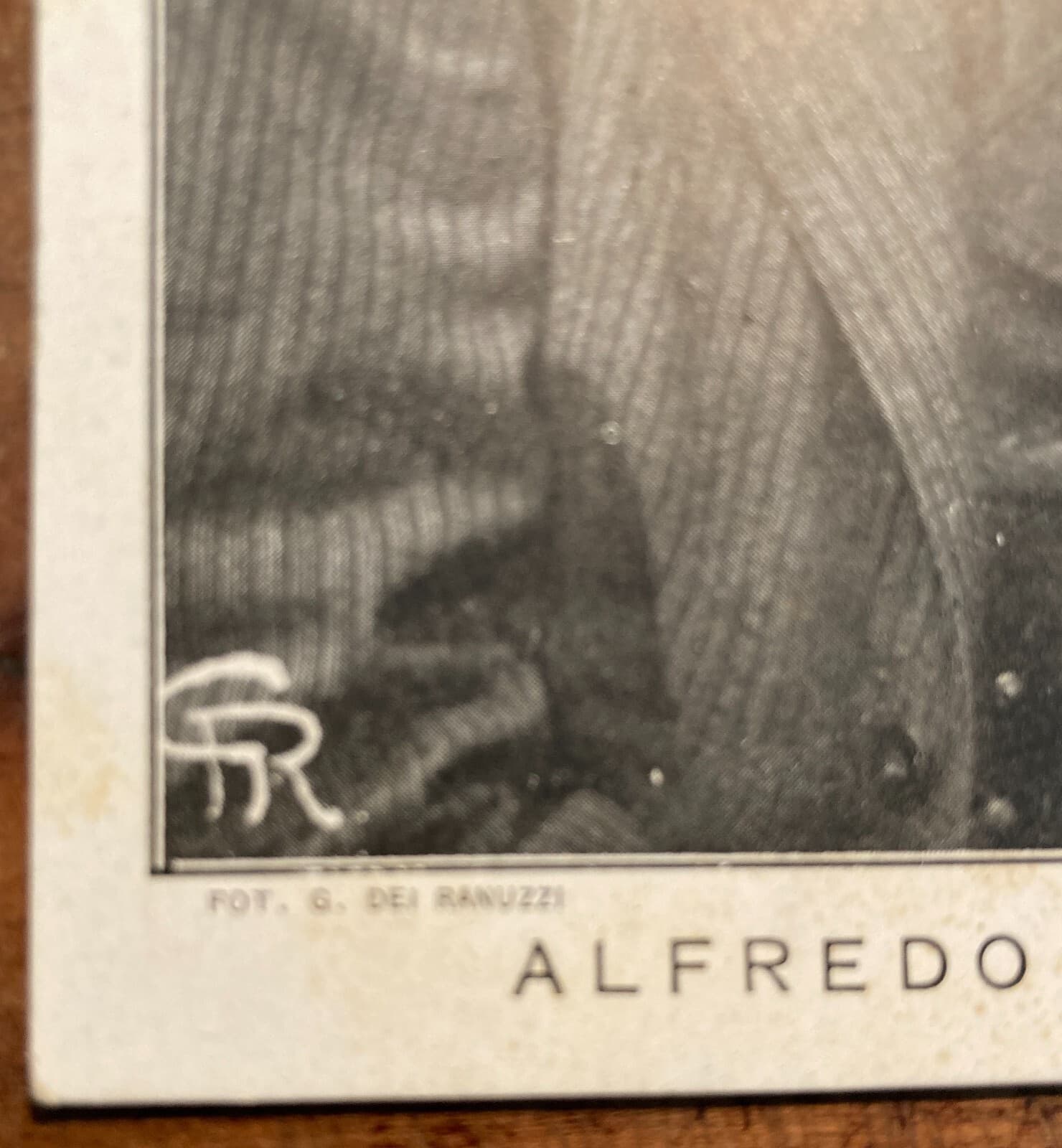 **Alfredo Oriani**. Interessante antico ritratto raffigurante il noto letterato italiano in una foto-cartolina. * **Editore**: Probabilmente **Laterza** (*Bari*), come indicato dalla pubblicità editoriale impressa al verso che elenca le opere dell'autore. * **Fotografia**: **G. Dei Ranuzzi**. * **Dimensioni**: 14x9 cm circa. * **Epoca**: Prima metà del '900. * **Condizioni**: Discreta conservazione generale con segni d'uso, sparse fioriture e bruniture marginali. * **Note**: Esemplare mai viaggiato, ideale per essere inserito sotto passe-partout.