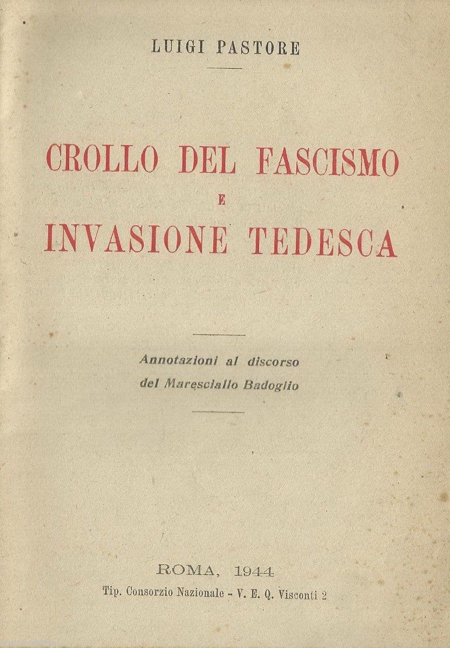 LUIGI PASTORE CROLLO DEL FASCISMO E INVASIONE TEDESCA ... Roma, Tip. Consorzio Nazionale, 1944 Cm.16,5; pp.14; bross. edit. Interessante edizione d'epoca, pubblicazione contenente annotazioni al discorso che il Maresciallo Badoglio pronunciò nell'ottobre 1943 nel rapporto tenuto agli ufficiali riuniti in S. Giorgio Jonico, con all'interno riferimenti relativi a: *la caduta del Fascismo* *crisi interna del Gran Consiglio, Villa Savoia, l' AGIP e il suo deficit di 90 milioni,* *il peso economico per lo Stato della GIL e dell'OND,* *il Ministero della Cultura Popolare "un vero e proprio lupanaro",* *la guerra, l'armistizio, il Convegno di Feltre, la Germania, la Venezia Giulia, la Romania, mancato scioglimento della Milizia, Eisenhower, Brindisi, Torino, Milano, rapina alla Banca Nazionale, gli Alleati, Churchill,...* DI INTERESSE STORICO, POLITICO, PROPAGANDISTICO, STORICO-LOCALE, BIBLIOGRAFICO *rara edizione, attualmente tre soli esemplari noti nel sistema bibliotecario nazionale italiano* Buona conservazione generale, usuali segni e difetti d'uso e d'epoca, sparse fioriture e difetti vari marginali. *(l'immagine allegata raffigura un particolare della copertina anteriore, eventuali ulteriori informazioni a richiesta)* * * * Il 27-giu-17 alle 19:47:58 CEST, il venditore ha aggiunto le seguenti informazioni sull'oggetto:
