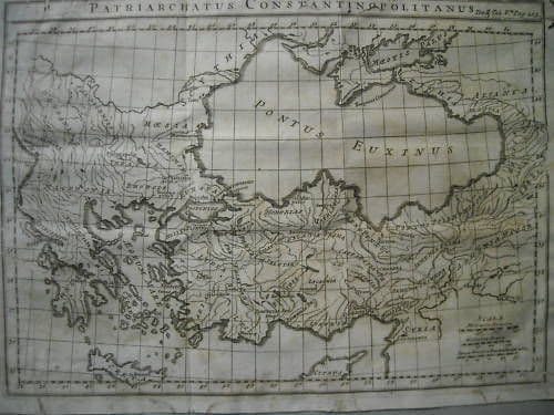 Patriarchatus Constantinopolitanus Interessante antica raffigurazione cartografica di alcuni territori balcanici ed ellenistici rientranti sotto il Patriarcato di Costantinopoli, con la Grecia e le sue numerose isole (Cicladi, Cipro, Rodi, Creta, Samo, Lesbo, Naxus,...), la Macedonia e la Tracia, la Scizia, l'Armenia, la Siria, ...e tantissimi toponimi relativi a piccole o grandi località ivi rappresentate. Incisione antica all'acquaforte, originale e d'epoca, in origine probabilmente tavola illustrativa f.t. di un'opera specialistica della metà del XVIII sec. (circa 1750); misura circa cm.24,5x34 circa (la sola parte incisa, alla battuta della lastra di stampa, esclusi i piccoli margini bianchi rifilati diseguali). Di interesse storico specialistico cartografico collezionistico Modesta conservazione generale, segni e difetti d'uso e d'epoca, usuali sparse fioriture, diffusa tarlatura estesa soprattutto lungo i vari lati, ma anche alcune gallerie che interessano l'immagine, fori parzialmente e sommariamente rinforzati e rattoppati maldestramente al verso del foglio; piegature e sgualciture e difetti vari marginali; su carta vergellata e con filigrana a soggetto araldico raffigurante un fiore tipo fiorentino (?); stampa meritevole di restauro, o almeno **meritevole di essere inserita sotto passpartout ed incorniciata.** (*le immagini allegate sono particolari dell' intero foglio, eventuali altre informazioni a richiesta)* [](https://img135.imageshack.us/i/greciamn.jpg/ "ImageShack - Image And Video Hosting")Uploaded with [ImageShack.us](https://imageshack.us/)