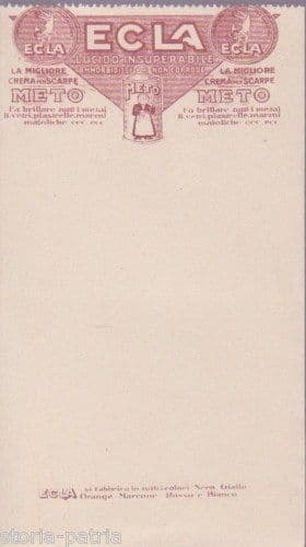 ECLA *LUCIDO INSUPERABILE* *AMMORBIDENTE* *NON CORRODE* METO *LA MIGLIORE CREMA PER SCARPE* *....* Interessante antica pubblicitaria, in origine foglietto ad uso taccuino o blocknotes utile per prendere appunti, *con bella intestazione litografica figurata riproducente una scatola di lucido ECLA, con raffigurato un jolly o un giocoliere,* *e un facsimile di tubetto per la crema per scarpe METO,* *crema utile non solo per lucidare scarpe, ma anche utile come brillantante per vetri , metalli, piastrelle, maioliche, marmi, ecc.* Misura circa cm. 13,5x7,5; foglio di carta impresso al recto, verso bianco, con margine superiore dentellato; databile alla prima metà del '900. DI INTERESSE PUBBLICITARIO E COLLEZIONISTICO PER LE VARIE TEMATICHE COLLEGATE Buona conservazione generale, usuali segni o difetti d'uso e d'epoca, **meritevole anche di essere inserito sotto passpartout ed incorniciato.**