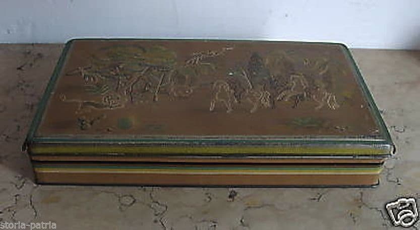 Chessa Bellissima antica scatola in latta, probabilmente in origine contenitore di dolciumi o biscotti, litografata su tutti i lati, e bella scena di caccia a decorazione del coperchio, *veduta con tre cacciatori a cavallo che inseguono e sparano ad un capriolo (?) che si addentra tra la vegetazione e visibile anche un leone e uccelli.* Opera di pregio artistico, eseguita e firmata dall'artista (sardo ?) Chessa Misura cm.36x21x6 circa; firma dell'artista impressa lateralmente; esemplare databile al primo '900 o anni '30 (?)  Di interesse artistico e collezionistico *molto rara sia per la tematica inusuale della caccia, sia per l'artista Chessa, ben noto anche per la sua vicinanza al movimento Futurista.* Buona conservazione generale, segni e difetti d'uso o d'epoca, sparse abrasioni, qualche usuale ammaccatura, rotture agli angoli del coperchio, usuale diffusa ossidazione.
