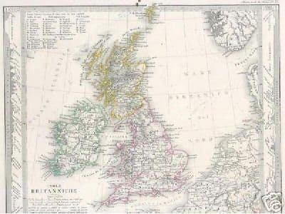 Interessante antica cartografia delle Isole Britanniche *(Great Britain)* La cartina rappresenta i seguenti territori: * Scozia * Inghilterra * Galles * Irlanda * Francia * Belgio * Paesi Bassi * Prussia Renana * Jutland * Norvegia * Ebridi *Ai due lati sinistro e destro è interessante notare un particolare grafico illustrato che indica in graduatoria i monti più alti di Scozia, Inghilterra, Irlanda, Galles ed Ebridi, con anche il Ben Nevis, i Monti Pennini, i Monti d'Irlanda, i Monti di Mac Gillicuddy, i Monti Cambriei; è anche segnalato lo Skager Rack, in Norvegia Lindesnaese, sotto il livello del mare.* *Sulla carta sono segnalate anche le dimensioni delle città attraverso differenti simboli (città di 100000, di 50000, di 20000, di 10000 abitanti o meno); le profondità del mare in brassati (6 piedi inglesi); le contee (Shires, Counties) nella Scozia, nell'Inghilterra, nell'Irlanda ed in Galles.* *Opera eseguita dai cartografi Stieler-Berghaus nel 1869; incisione originale all'acquaforte, ben impressa e impreziosita dalla coeva ed originale coloritura a mano dei confini regionali o territoriali; misura circa cm. 31x24 (l'intero foglio)* Di interesse storico-locale, geografico e collezionistico *ma soprattutto da studio, per la ricchezza dei toponimi presenti, molti dei quali probabilmente non più esistenti o ridenominati, come pure per l'esame della viabilità e della struttura geologica dei territori interessati.* Buona conservazione generale, segni e difetti d'uso e d'epoca, due piccole macchie marginali, sparse fioriture, **meritevole anche di essere inserita sotto passpartout ed incorniciata.**