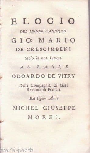 Michel Giuseppe Morei Elogio *del Signor Canonico* Gio. Mario de Crescimbeni Steso in una lettera al Padre Odoardo de Vitry *della Compagnia di Gesù* *Ricevitore di Francia* *dal Signor Abate* Michel Giuseppe Morei S.i.t. , s.d. (Venezia, prima metà del '700) Cm.14,5; pp. (da pag.477 a pag.500); senza legatura. Interessante edizione originale antica e d'epoca, raro elogio biobibliografico del marchigiano Crescimbeni, *con all'interno numerose citazioni, tra cui riferimenti a Carlo D'Aquino, Arcadia, Gianicolo, San Pietro in Montorio, Padri Minori, Marcello Severoli, Clemente XI, Santa Maria in Cosmedin, Portogallo, Principe Eugenio di Savoia, Duchi di Parma, Gran Maestro di Malta, Roma, Tivoli, Violante Beatrice di Baviera, ...* elogio scritto a guisa di corrispondenza, datata a stampa Badia di Grottaferrata, novembre 1728; Di interesse storico-locale e bibliografico *rarissima edizione, **nessun esemplare noto** nel sistema bibliotecario nazionale italiano.* Discreta conservazione generale, segni e difetti d'uso e d'epoca, diffuse fioriture, opera slegata e parzialmente sciolta, senza legatura o copertine (la pubblicazione in origine faceva parte di una raccolta miscellanea di scritti vari), pertanto meritevole di rilegatura.