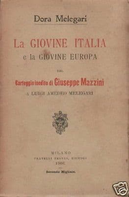 Dora Melegari La Giovine Italia e la Giovine Europa Dal carteggio inedito di Giuseppe Mazzini a Luigi Amedeo Melegari Milano, Treves, 1906. Cm.19,5; pp. 345; bross. edit. (difetti) Interessante edizione originale e d'epoca, opera dedicata "alla Gioventù Italiana", e con ampia trattazione distinta in due parti così articolate: *Giovine Italia: Marsiglia e la gioventù italiana; i Veri italiani; moti rivoluzionari in Italia; i viaggiatori; il colpo di Tolon; bandiera e comitato d'insurrezione; la spedizione di Savoia;...* *La Giovine Europa: Mazzini e Ramorino dopo la spedizione di Savoia; l'emancipazione della Francia; costituzione della Giovine Europa; la Giovine Svizzera; sulla via di un nuovo esilio;...* Di interesse culturale, storico e bibliografico Buona conservazione generale, segni o difetti d'uso e d'epoca, difetti al dorso della brossura, firma exlibris al frontespizio.