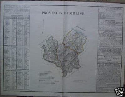 Interessante grande carta geografica della Provincia di Molise comprendente tutta la regione, con i Distretti di Campobasso - Isernia - Larino con estensione a nord dal confine con la Provincia di Abruzzo Citra ed Ultra, delimitata dal corso del fiume Trigno, a ovest con la Provincia di Terra di Lavoro e a sud con la Provincia di Capitanata e Principato Ultra. Opera eseguita dal noto cartografo napoletano (ma pugliese) Benedetto Marzolla **In Napoli 1831** **Incisione originale litografica**, misura cm.45,5X 59,5 (foglio, con margini diseguali)  Esemplare di grande interesse storico documentario e geografico, oltre che statistico-economico, essendo l'unica cartografia antica ad avere anche una descrizione delle principali attività economiche, cenni storici, struttura amministrativa, distribuzione delle diocesi, tribunali, dogane, popolazione,.... Citate le Diocesi di Bojano, Isernia, Larino, Termoli, Trivento Coloritura originale coeva eseguita a mano Tantissimi i toponimi citati, molti probabilmente ora inesistenti o ridenominati; interessante la rete viaria e la struttura geologica di tutto il territorio della Provincia. Magnifica opera, di grande interesse collezionistico, da studio e molto decorativa. Buona conservazione generale, segni o difetti d'uso e d'epoca, usuale piegatura centrale con minimi difetti.