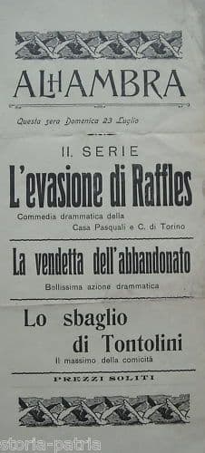 Alhambra *....* S.i.t., s.d. (primo '900) Cm. 35,5x16,5 (l'intero foglio, a margini bianchi diseguali) Interessante edizione originale antica e d'epoca, raro foglio volante, pubblicitario di spettacoli da tenersi al teatro Alhambra, il 23 luglio, con rappresentazione di una commedia drammatica della Casa Pasquali (Torino) intitolata "*L'evasione di Raffles";* *La vendetta dell'abbandonato (bellissima azione drammatica)* *Lo sbaglio di Tontolini ("il massimo della comicità")* *Locandina d'epoca, impreziosita da un fregio illustrativo in alto e in basso raffigurante colombe in volo; non è stato possibile identificare il teatro Alhambra sede delle commedie, forse in Abruzzo o Piemonte?)* Di interesse teatrale e collezionistico Discreta conservazione generale, segni e difetti d'uso e d'epoca, piegature e sgualciture, difetti marginali con strappetto ad un angolo, tracce di vecchio sporco; **meritevole anche di essere inserito sotto passpartout ed incorniciato.** *(l'immagine allegata raffigura un particolare dell'intero foglio, eventuali altre informazioni a richiesta)*