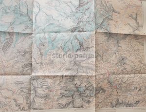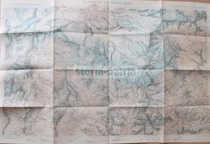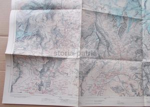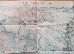 Interessante mappa geografica d'epoca raffigurante le regioni alpine dei gruppi montuosi del Cervino e del Monte Rosa. La cartografia include i territori circostanti con numerosi toponimi di località montane, la conformazione geofisica, la viabilità, laghi, fiumi e ghiacciai.