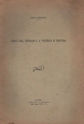 Lino Lazzarini Amici del Petrarca a Venezia e Treviso Venezia, R. Deputazione, 1934 Cm.24,5; pp. 16; bross. edit. Interessante edizione d'epoca, in cui vi è una dissertazione letteraria filologica apparsa nell'Archivio Veneto in merito allo stato della letteratura e cultura nel veneto dopo il cosidetto preumanesimo veneto e prima dell'Umanesimo del '400, con il Petrarca amico anzitutto del doge Andrea Dandolo e del grancancelliere Benintendi dei Ravagnani,...nei quattro anni del suo soggiorno in terra veneta, anni che videro un discreto flusso di personaggi nella frequentazione della casa in Riva degli Schiavoni; tra le varie e nuemrose citazioni troviamo i nomi di Francesco Bruni, Pietro Domenico da Baone (già Vescovo di Treviso), Francesco da Lanzenigo, Paolo de Bernardo, Nicolò Ciera, Gasparino Favacio, Martino Pozzati da Montebelluna, notaio Vittore da Plovenzano, Giovanni da Orvieto, Francesco da Brossano, .... con anche in appendice la trascrizione in latino di alcuni antichi documenti. Opera di interesse culturale, letterario, storico-locale, filologico, bibliografico Buona conservazione generale, segni e difetti d'uso e d'epoca, sparse fioriture o difetti vari alle copertine, ma complessivamente esemplare molto ben conservato.