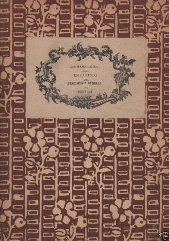 Gerolamo Lazzeri Un capitolo del "fenomeno Benelli" Barga, Bertagni, 1912 Cm.24, pp.14, antico cartonato (difetti) Interessante antica edizione d'epoca, articolata e dotta disamina dell'opera del noto letterato e commediografo Sem Benelli. Di interesse culturale letterario e bibliografico Buona conservazione generale, segni e difetti d'uso e d'epoca, annotazione manoscritta "ricordo dell'autore", legatura in cartoncino a decorazioni floreali, conservate le copertine originarie, piegatura ad un angolo inf., esemplare ancora a fogli chiusi.