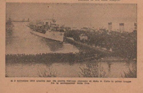 Trieste *Venti secoli di storia di una città italiana* Roma, 1945 Cm.27,5; pp. 16; senza legatura. Interessante edizione antica e d'epoca, pubblicazione che tende a dimostrare l'autentica italianità di Trieste, scorrendo la sua storia dalle *origini romane,* *alla lotta per l'autonomia comunale* *moti d'italianità durante il Risorgimento* *l'Irredentismo* *il tutto integrato da alcune figure illustrative: l'arco romano detto di Riccardo, panorama del Castello di S. Giusto, panorama di Trieste da Barcola, ritratto di Guglielmo Oberdan, targa bronzea in onore dell'Oberdan (che venne collocata sul luogo del suo supplizio), veduta del monumento scultoreo ad Oberdan;* *navi da guerra al molo di S. Carlo il 3 novembre 1918 accolte da folla festante.* Di interesse storico-locale, politico, militare, bibliografico Buona conservazione generale, usuali segni o difetti d'uso o d'epoca, piegatura centrale, sparse fioriture o bruniture. *(l'immagine allegata raffigura una delle figure illustrative presenti nel testo)*