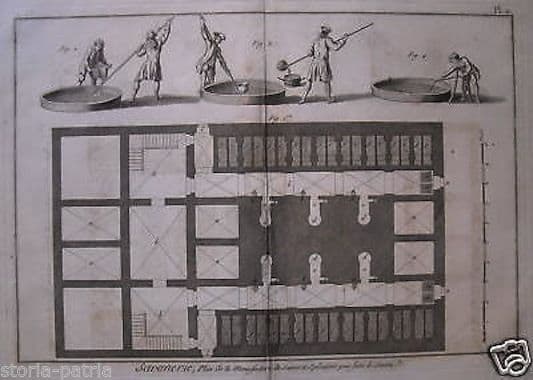 Savonerie ... *Bella antica veduta di alcune fasi della lavorazione del sapone,* *con visibili anche alcuni operai dell'epoca, e una pianta forse dei vari locali o scompartimenti.* Incisione antica e originale all'acquaforte, probabilmente in origine tavola illustrativa di un'opera specialistica francese sulle antiche arti e mestieri; misura cm. 28,5x42 circa (misura dell'intero foglio, compresi i margini bianchi diseguali); esemplare firmato a stampa da Benard, databile alla fine del '700. Di interesse artistico specialistico collezionistico decorativo Buona conservazione generale, segni e difetti d'uso e d'epoca, diffuse fioriture, inevitabile piegatura centrale, su carta vergellata; **meritevole di essere inserita sotto passpartout ed incorniciata.** *(l'immagine allegata raffigura un particolare dell'intero foglio, ossia la sola parte incisa)*