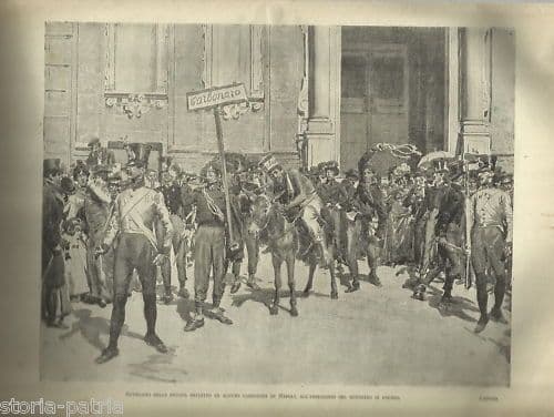 *Supplizio della frusta* *inflitto ad alcuni carbonari in Napoli, all'insediarsi del ministro della polizia Canosa* Interessante antica veduta, raffigurante un episodio legato agli avvenimenti risorgimentali italiani, in particolare connesso alla setta segreta della Carboneria, con uno degli affiliati -un carbonaro- in groppa ad un asino e con cappello identificativo in testa, mentre viene frustato alla presenza di un affollato pubblico di napoletani, uomini donne e ragazzi in abito d'epoca, e con alcuni gendarmi in divisa, dei quali uno -con tromba- precede l'asino col carbonaro, innalzando un cartellone con la scritta "carbonaro"; stampa antica, di belle dimensioni, misura circa cm.30x22 (l'intero foglio, compresi i margini bianchi diseguali); foglio originariamente edito quale tavola illustrativa fuori testo (verso bianco) di una pubblicazione storico risorgimentale del primo '900. Di interesse storico, risorgimentale, storico-locale, militare, collezionistico Buona conservazione generale, segni e difetti d'uso e d'epoca, sparse fioriture, difetti vari marginali, **meritevole di essere inserita sotto passpartout ed incorniciata.** *(l'immagine allegata raffigura un particolare dell'intero foglio, eventuali ulteriori infromazioni a richiesta)*