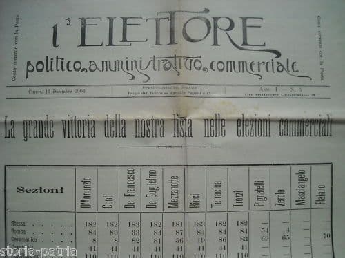 L'Elettore *Politico, Amministrativo, Commerciale* **Chieti, Tip. Ricci, 11 dicembre 1904 (Anno 1, n.5)** Cm.50x35 circa; pp.4; senza legatura. Interessante antica e rara edizione originale e d'epoca, antico periodico abruzzese, edito in Chieti, in formato giornale, diretto da Giuseppe Imbastaro, con all'interno scritti di interesse storico-locale, politico, economico, documentario,...; in particolare esemplare dedicato al resoconto delle locali Elezioni Commerciali, con i nominativi dei candidati e i voti presi nelle varie circoscrizioni della provincia chietina; con citati i candidati: *D'Annunzio, Conti, De Francesco, De Guglielmo, Mezzanotte, Ricci, Terracina, Trozzi, Pignatelli, Zerolo, Masciangelo, Flaiano;* e con riferimento alle città o paesi abruzzesi: *Atessa, Bomba, Caramanico, Carunchio, Casalbordino, Casoli, Castiglione Messer Marino, Celenza sul Trigno, Chieti, Fossacesia, Gissi, Guardiagrele, Lama dei Peligni, Lanciano, Manoppello, Ortona a Mare, Palena, S.Buono, S. Valentino, S. Vito Chietino, Tocco Casauria, Tollo, Torricella Peligna, Vasto, Villa S. Maria;* *con scritti intitolati:* *Le elezioni commerciali e la disfatta dei liberali* *Ancora tasse e debiti* *La convalidazione dell'elezione dell'on. Mezzanotte* *La teppa* *Il Te Deum della sconfitta* *La giustizia dei liberali* *Cronaca: Agli operai; L'on. Tedesco opta per Ortona; La musica cittadina (citato il maestro Cavina e l'opera il Mefistofele); La condanna di un prete (citato l'abate di Filetto Raffaele Tenaglia, il sac.De Iacobis di Orsogna, Giovannina Carpineto e il maestro Luigi Libertini di Filetto)* Di interesse storico-locale, politico, giuridico-economico, collezionistico, bibliografico *rarissimo esemplare, probabilmente unico superstite, come un pò tutti gli antichi giornali locali, usualmente editi in tirature molto limitate.* Buona conservazione generale, segni e difetti d'uso e d'epoca, piegature e sgualciture e difetti vari marginali. (l'immagine allegata raffigura un particolare dell'intero giornale, ossia parte della testata, eventuali ulteriori informazioni a richiesta).