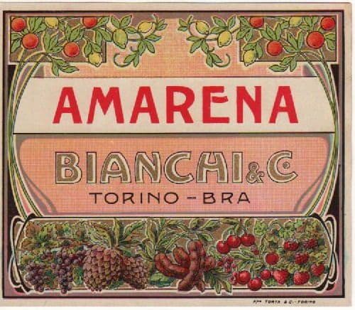 Etichetta Amarena Bianchi Bra Torino Liberty Cromolitografia 1900