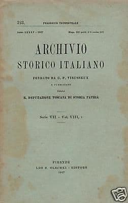 Archivio Storico Italiano Firenze, Olschki, 1927-1928. Cm.25, pp.368, bross. edit. Interessante antica e rara pubblicazione relativa alla storia locale toscana, edizione in due distinti volumi, ma con numerazione progressiva, a cura della Deputazione Toscana di Storia Patria. Ampio e articolato il contenuto, del quale non è ovviamente possibile dare una esauriente sintesi, ma in cui troviamo, oltre a notizie varie e a recensioni bibliografiche: *"Costituzioni dello Stato della Chiesa anteriori alla riforma albornoziana" (P. Sella)* *"Per la biografia di Bonagiunta Orbicciani. Omonimie disturbatrici" (F.P.Luiso)* *"Documenti inediti dei duchi e marchesi di Tuscia. Secc. VII-XII" (A. Falce)* *"I beni demaniali nella più antica finanza del Comune di Firenze" (B. Barbadoro)* *"Vincenzo Gioberti e la vertenza tosco-piemontese della Lunigiana" (A. De Rubertis).* *.........* Ricco notiziario e ampie citazioni o recensioni biliografiche, tra cui rileviamo: *Piacenza e i Paratici piacentini; La schiavitù domestica in Sicilia; Umanesimo in Portogallo; Pubblicazioni dei Bollandisti; L'idea imperiale di Federico II; L'Archivio di Montevergine;* ....e tantissime altre di cui non è possibile dare sintesi e relative anche ad altre regioni d'Italia o a Stati esteri. Opera di interesse culturale, storico-locale e bibliografico Buona conservazione generale, usuali segni o difetti d'uso e d'epoca, sparse fioriture o difetti marginali alle copertine.