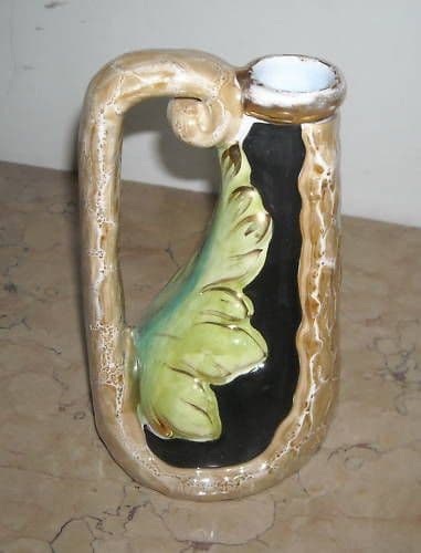 # Inusuale bottiglia in ceramica di artistico modellato, probabilmente opera di ceramista-designer del Novecento italiano, forse di area lombarda, esemplare con motivi decorativi vegetali in rilievo, e con policromatura e dorature, *in origine bottiglia ad uso contenitore di liquore, marcata sotto la base con il tipico simbolo figurato coronato e la scritta* Coronetti *Cunardo* Misura circa cm. 21 (altezza) x 12x10 circa; marchio impresso sotto il fondo; databile alla metà del '900 (?)  ## Decorativa e da collezione Buona conservazione generale, usuali segni e difetti d'uso o d'epoca, non presente il tappo (ma probabilmente in origine doveva esserci un sughero sigillato; bottiglia ovviamente vuota del suo originario contenuto, complessivamente buon esemplare.