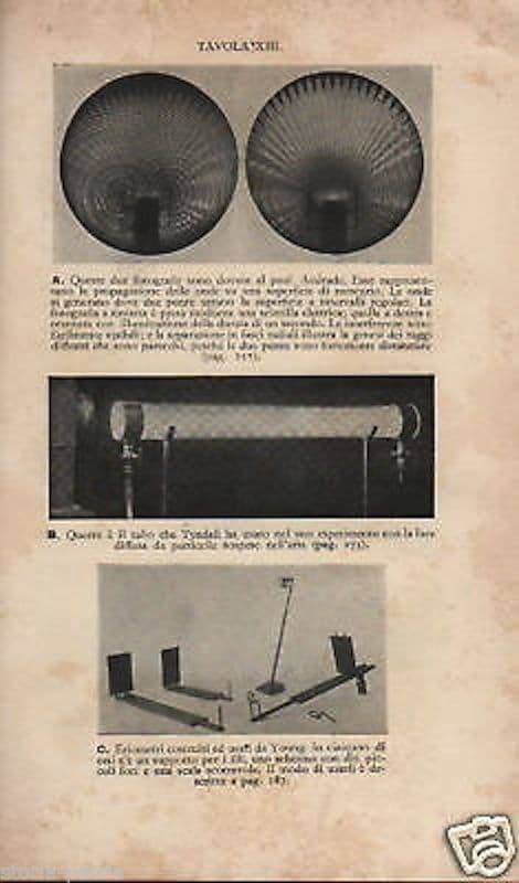 BRAGG WILLIAM IL MONDO DELLA LUCE Milano-Roma. Tumminelli, 1935 Cm.22, pp. 302, telato edit. Interessante antica edizione d'epoca, ricco volume a cura del noto Premio Nobel, Bragg, nella traduzione di Giovanni Wataghin, con ampia disamina di carattere scientifico fisico ottico e capitoli su: *LA NATURA DELLA LUCE: IPOTESI DI NEWTON, RIFLESSIONI SU SUPERFICIE PIANA, VISIONE BINOCULARE, LO SPECCHIO MAGICO,...* *L'OCCHIO E LA VISIONE: IMMAGINE FORMATA DA UNA LENTE, DIFETTI OTTICI DEGLI OCCHI E MODO DI CORREGGERLI, INGRANDIMENTO, MICROSCOPIO E TELESCOPIO, ASTIGMATISMO, ILLUSIONI VARIE, RIFRAZIONE ATMOSFERICA, MIRAGGIO, RIFLESSIONE E RIFRAZIONE DEL DIAMANTE,...* *COLORI: LO SPETTRO CROMATICO, AZIONE DEL PIGMENTO, OCCHIO E COLORE, ILLUSIONI DI COLORI, EFFETTO CROMATICO DELLE LENTI, ACROMATISMO,...* *ORIGINE DEI COLORI: RISONANZA, VIBRAZIONE DI ATOMI E MOLECOLE, INTERFERENZA DI YOUNG, PELLICOLE DI SAPONE, ...* *I COLORI DEL CIELO: ALBA, TRAMONTO, NUBI, COLORE DEL MARE, ACQUA TORBIDA, ALONI DEL SOLE E DELLA LUNA, ERIOMETRO DI YOUNG,...* *POLARIZZAZIONE DELLA LUCE: SPATO D'ISLANDA, IL TRATTATO DI HUYGENS, ESPERIMENTO DI MALUS, FRESNEL, PRISMA DI NICOL, ....* *LUCE DEL SOLE E DELLE STELLE: SPETTRI DELLE STELLE, SPETTRO SOLARE, RADIAZIONE INVISIBILE, SCARICHE ELETTRICHE E LUCE ULTRAVIOLETTA,...* *RAGGI RONTGEN: LA SCOPERTA DI CROOKES, RAGGI CATODICI, RAGGI X, CRISTALLI, ESPERIMENTO DI RAYLEIGH, LUNGHEZZE D'ONDA,...* *ONDE E CORPUSCOLI: EFFETTO FOTOELETTRICO, PRODUZIONE DI RAGGI X, ESPERIMENTO DI INNES, LA COPPIA NEUTRA, METODO DELLA NEBBIA DI WILSON, FOTONI ED ELETTRONI, ....* Con ampio apparato illustrativo, figure nel testo e tavole fuori testo. OPERA DI INTERESSE CULTURALE SCIENTIFICO SPECIALISTICO OTTICO OCULISTICO BIBLIOGRAFICO Buona conservazione generale, segni e dIfetti d'uso o d'epoca, fioriture sparse.