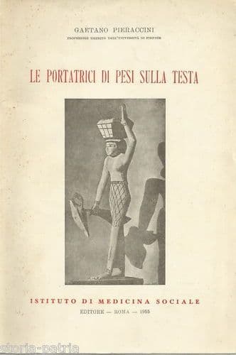 Gaetano Pieraccini Le portatrici di pesi sulla testa ... Roma, Ist. Medicina Sociale, 1955 Cm.24, pp. 155, bross. edit. figurata (difetti) Interessante edizione d'epoca, bel volume specialistico del ricercatore fiorentino relativo allo studio delle problematiche medico-sociali connesse al trasporto di carichi e al lavoro differenziato sessualmente in età remote, con capitoli e riferimenti a: *vari sistemi di trasporto dei pesi, direttamente addossati, a opera dell'uomo* *trasporti di pesi sulla testa o ad incapatura* *trasporti sulla testa pratica comune della donna* *diffusione territoriale geografica e intersessuale* *Bertillon, Stratz, Maraz, Biasutti, Hutchinson* *incapatura nella storia della civiltà* *documentazione iconografica per regioni e popolazioni* *Sumeria* *Babilonia, Assiria, Persia* *Egitto* *arte cretese-micenea, arte ellenistica, Etruria, Roma, Italia del Medioevo e d'oggi* *trasporto dei pesi incapati nell'Europa moderna* *personalità dell'anfora, varietà di anfore, anfore da ornamento e da acqua* *perchè l'uomo fabbricò l'anfora* *architettura anatomica del cranio* *carico sulla testa e asse articolare cranio-vertebrale* *fisiopatologia e patologie, muscoli, equilibrio, meccanica statica, ...* *il cammino degli incapati, sudorazione, ossatura, mammelle, i portatori della montagna* *resistenza di marcia* *estetica delle portatrici* *bambini portati in sacche addorsate o fissati intorno alla fronte della madre* *meccanica respiratoria durante il lavoro* *il lavoro e le occupazioni della donna in Egitto e Grecia, in Etruria, a Roma* *aratori in sequenza* *emancipazione della donna* *prove sperimentali* *....* *opera arricchita da schemi e da numerose illustrazioni fotografiche ("con 40 illustrazioni figurate")* Di interesse scientifico, specialistico medico ortopedico sociale, antropologico, storico-locale, bibliografico Buona conservazione generale, segni e difetti d'uso e d'epoca, sparse fioriture, difetti vari marginali con piccola rottura marginale lato dorso.