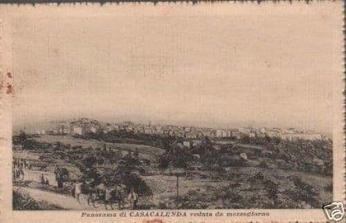 Casacalenda Panorama - Veduta da Mezzogiorno Bella antica e rara veduta della nota cittadina molisana, in provincia di Campobasso, con il profilo del paese e delle case, ma anche in primo piano alcuni viandanti locali, contadini, uno con due asini che portano tini, forse per l'uva durante la vendemmia. Cartolina originale e d'epoca, misura circa 9x14 cm.; viaggiata per posta e affrancata, spedita nel 1915, ma forse anche di edizione precedente (spesso e sopratutto nei piccoli paesi di provincia la diffusione delle cartoline era talmente scarsa che le stesse potevano essere utilizzate anche negli anni successivi); edita da Cavaiola (Casacalenda). Di interesse storico-locale, fotografico, folklorico e collezionistico Discreta conservazione generale, segni e difetti d'uso e d'epoca, piegatura e sgualciture, piccola macchia marginale, affrancatura e francobollo conservati, spedita da Casacalenda a Carpi (Modena); **meritevole anche di essere inserita sotto passpartout ed incorniciata.**