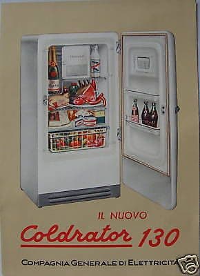Frigorifero elettrico **Coldrator 130** CGE - Milano Interessante pieghevole pubblicitario d'epoca, con anche illustrazioni all'interno, relative al frigorifero della ditta milanese CGE. Misura cm. 21x15 circa; pp. 4; databile alla metà del '900; ediz. Bonetti (Milano) Da collezione! Buona conservazione generale, usuali segni o difetti d'uso o d'epoca. * * * Il 07-ott-09 alle 18:03:22 CEST, il venditore ha aggiunto le seguenti informazioni sull'oggetto: Preferito il pagamento con bonifico bancario, a richiesta eventuali altre modalità; l'opzione di pagamento con paypal è valida prevalentemente per i Paesi extraeuropei, la sua accettazione potrebbe comportare l'aggiunta delle relative spese, mentre la spedizione sarà fatta solo dopo l'avvenuto trasferimento dei relativi fondi: a richiesta eventuali altre informazioni.
