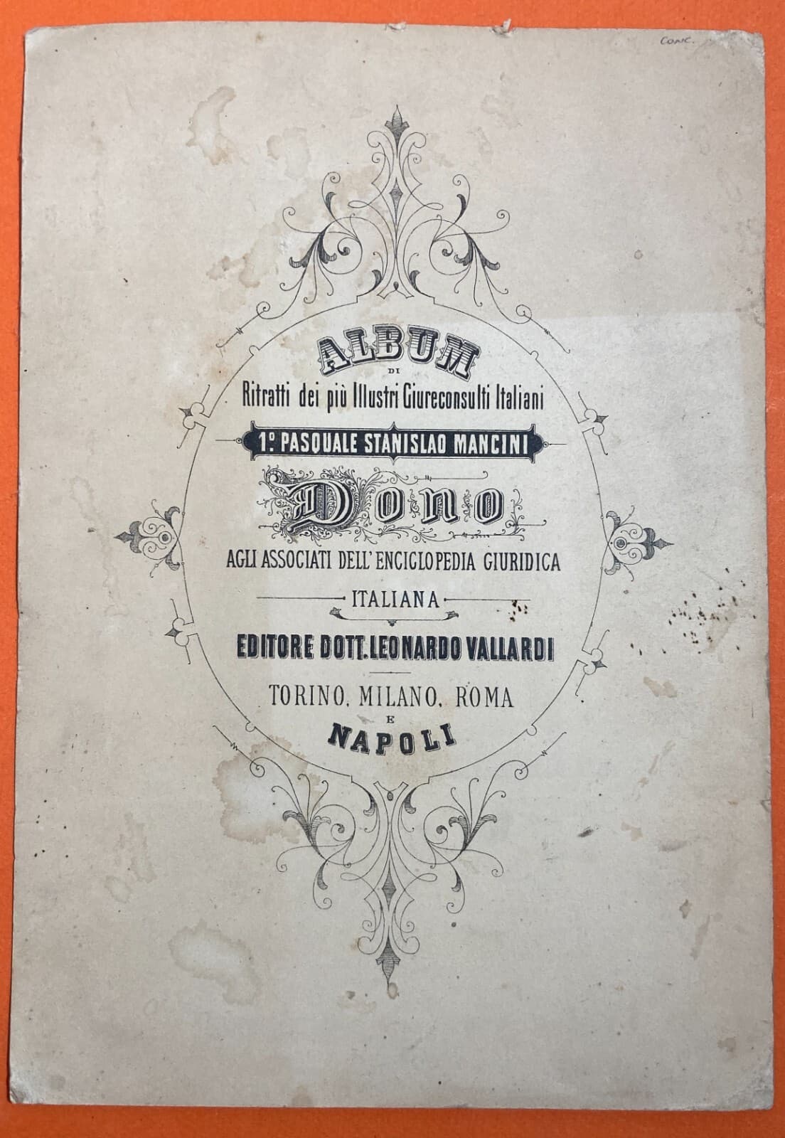 **Pasquale Stanislao Mancini**. Interessante antica fotografia d'epoca raffigurante il celebre personaggio politico italiano originario di *Castel Baronia* (*Avellino*). Il ritratto è applicato su un cartoncino di supporto riccamente litografato con motivi allegorici, tra cui un puttino e la figura della Giustizia con spada e bilancia. L'esemplare fu ideato dalla casa editrice **Vallardi** di *Milano* per una serie dedicata agli illustri giureconsulti italiani, offerta in dono agli associati dell'Enciclopedia Giuridica Italiana. * **Dimensioni fotografia**: circa 13 x 9,5 cm. * **Dimensioni supporto**: circa 30 x 21 cm. * **Tecnica**: fotografia montata su cartoncino litografato da **Beliazzi**. * **Dettagli**: firma autografa in facsimile del Mancini al recto; propaganda editoriale Vallardi al verso. * **Epoca**: fine XIX - inizio XX secolo. **Condizioni**: conservazione generale modesta, con segni d'uso e del tempo, fioriture, bruniture, lievi erosioni marginali. La fotografia centrale si presenta complessivamente ben conservata.