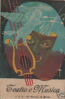 **Teatro e Musica** **Catalogo** **1954** Roma, L.E.S., 1954 (Tip. Zampetti, Velletri) Cm.17, pp. 196, bross. edit. figurata. Interessante catalogo editoriale, con ricco elenco di titoli relativi a opere musicali e teatrali, distinte per *Teatro maschile* *Teatro femminile* *Teatro promiscuo* *Raccolte e manuali del teatro* *Musica: canti gregoriani, canti del vespro, musica per organo, canti per i santi, canti patriottici, canti accademici, ...* *Scherzi comici* *Operette teatrali* Bella grafica di copertina, a colori, con raffigurazione allegorica simbolica, con allegoria della musica e del teatro, arpa, maschere,... grafica di gusto quasi futurista, a firma **"G.ianet '51"** (?) Di interesse specialistico e bibliografico Buona conservazione generale, usuali segni d'uso o d'epoca.