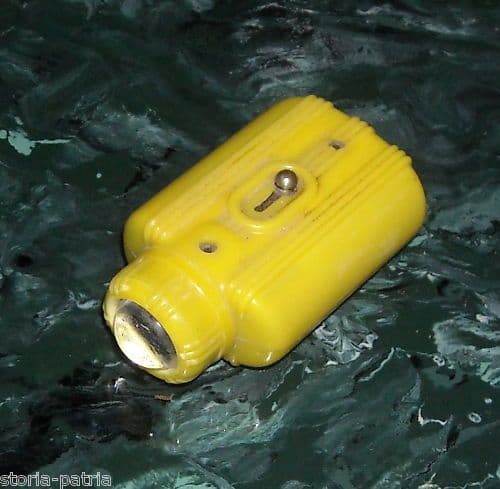 Astra Interessante e d'epoca, grazioso vecchio fanalino tascabile, a batteria, con meccanismo per l'accensione, e lente di proiezione molto spessa e pertanto utile per ingrandire ed ampliare il fascio di luce emesso; in materiale plastico duro di colore giallo (forse bakelite ?), e lente di ingrandimento vitrea; misura circa 7,5x4,5x3 (dimensioni massime); marchio di fabbrica impresso a rilievo; databile presumibilemente alla metà del '900 (?) Di interesse specialistico, tecnico, collezionistico Buona conservazione generale, segni e difetti d'uso e d'epoca, non verificata la funzionalità e pertanto non garantita l'integrità e la corretta funzionalità, pertanto esemplare da pulire e revisionare, non presenti le pile o batterie per il suo funzionamento elettrico. *(eventuali ulteriori informazioni a richiesta)*