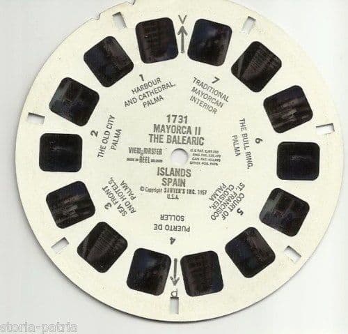 Stereo Disco Generalstereo Spagna Isole Baleari Maiorca II *7 vedute in rilievo, colori Kodachrome* Interessante raccolta di sette immagini fotografiche, relative alla nota isola spagnola, vedute fotografiche inserite in un disco cartaceo, che potevano (e possono) essere visionate inserendo il disco in un apposito apparecchio o visore stereo, con visione tridimensionale o stereo, per cui ogni veduta corrisponde a due fotogrammi, quindi complessivamente per sette vedute sono presenti intorno al disco 14 fotogrammi; presenti vedute di: *Palma: Harbour e Cattedrale* *Palma: La città vecchia* *Palma: Lungomare e Hotels* *Puerto de Soller* *Palma: Court of St. Francisco Cloister* *Palma: The Bull Ring* *Traditional Mayorcan Interior* disco di circa cm. 9 (diametro), inserito in astuccio di circa cm.9x9; edizione Generalstereo (Milano); databile alla metà del '900 (circa anni '60 ?). Di interesse storico-locale, fotografico, collezionistico Buona conservazione generale, usuali segni e difetti d'uso e d'epoca, strappi e sgualciture al folder o astuccio cartaceo. ##### della stessa serie sono disponibili anche dischi con vedute fotografiche di altre città italiane ed estere, eventuali ulteriori informazioni a richiesta.