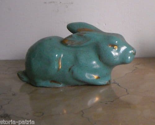 Decorativa ceramica bella piccola graziosa scultura, raffigurante un coniglio (o una lepre ?) in maiolica decorata e smaltata di un bel colore verde e con alcuni tocchi di doratura per evidenziare meglio gli occhi o le orecchie o altri parti del corpo; belle piccole dimensioni, misura circa cm. 13 (lunghezza totale) x 5 (x 6 cm. altezza); superficie interamente smaltata lucida; nessun marchio visibile, probabilmente ascrivibile a manifattura ceramica toscana (Sesto Fiorentino ? o Deruta ? o altra simile); databile presumibilmente alla metà del '900 Decorativo e da collezione Buona conservazione generale, segni e difetti d'uso e d'epoca, ma complessivamente molto ben conservato, bel soprammobile o utile per la vetrina del collezionista di soggetti tematici o di caccia.