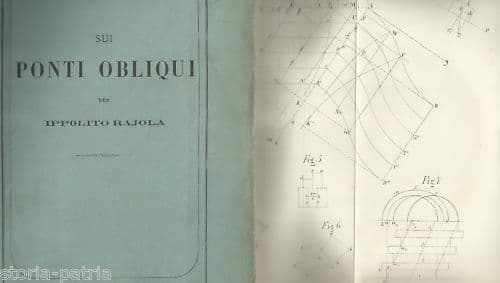 Ippolito Rajola Sui ponti obliqui .... Napoli, F.lli Testa, 1871 Cm. 22, pp. 36, bross. edit. (difetti) Interessante antica e rara dissertazione specialistica tecnico-ingegneristica, arricchita anche da una tavola litografica ripiegata f.t., *relazione per la laurea di ingegneria presso l'Università di Napoli.* Di interesse specialistico tecnico ingegneristico architettonico bibliografico *rarissima edizione originale,* ***nessun esemplare noto*** *nel sistema bibliotecario nazionale* Buona conservazione generale, segni e difetti d'uso e d'epoca, sparse fioriture, dedica autogr. dell'A. *(l'immagine allegata raffigura un particolare della cop. ant. e della tavola illustrativa)*