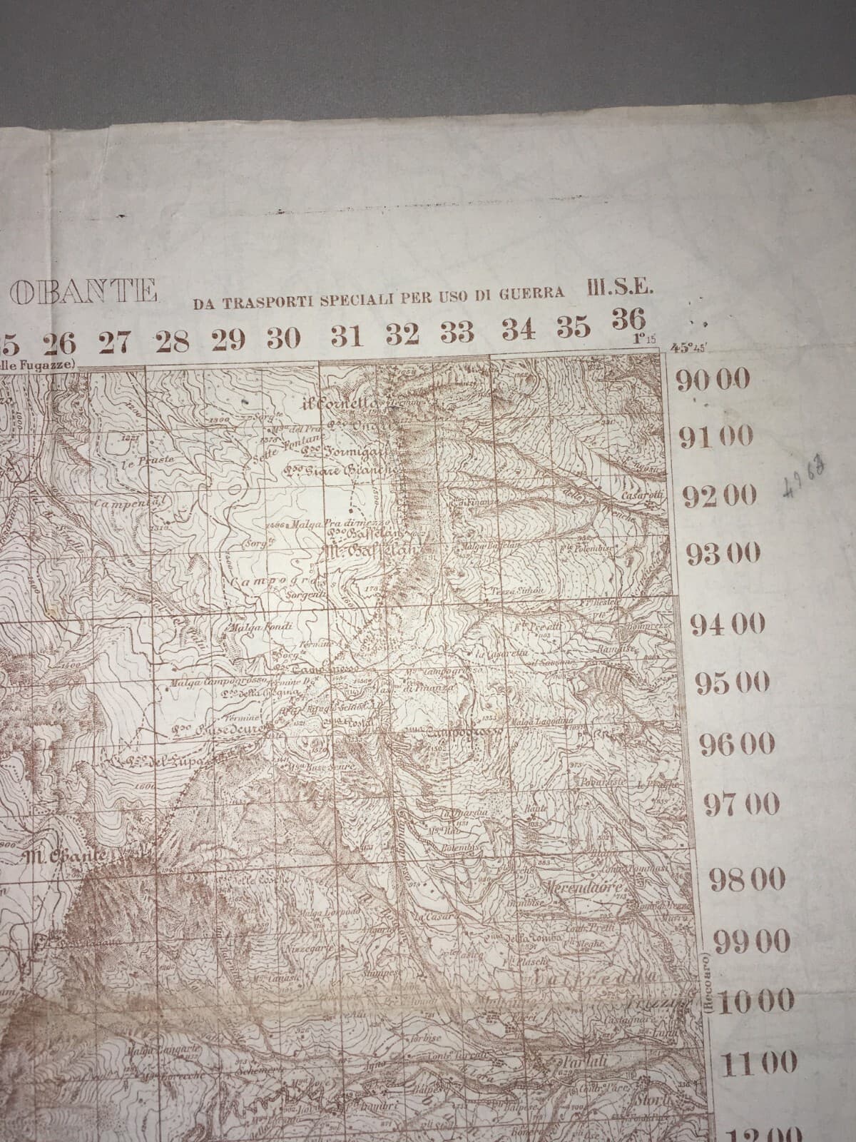**Monte Obante**. Interessante mappa geografica con la topografia dei territori circostanti il *Monte Obante* (Verona), riportante numerosi toponimi e la viabilità d'epoca. La mappa faceva parte di una più ampia *Carta d'Italia*, specificamente destinata a "trasporti speciali per uso di guerra". Il foglio è impresso su entrambi i lati: * **Recto**: Topografia di *Monte Obante*. * **Verso**: Topografia di *Longare* (*Vicenza*) e aree limitrofe (*Lumignano*, *Castegnero*, *Villaganzerla*), probabilmente una bozza annullata con segni verdi. Il documento reca le diciture "riservato personale" e "con le aggiunte e varianti al Luglio 1917", risalendo pienamente al periodo della **Grande Guerra**. * **Dimensioni**: circa 52x51 cm. * **Stato di conservazione**: Discreto. Segni d'uso, fioriture, bruniture e pieghe d'epoca. Piccoli fori sparsi visibili in controluce. Difetti marginali parzialmente mascherabili con l'incorniciatura.