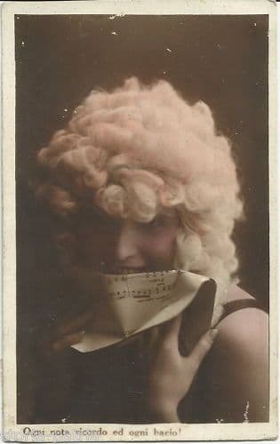 *"Ogni nota ricordo ed ogni bacio!"* Interessante deliziosa e maliziosa immagine di giovane donna, affascinante nei suoi folti capelli biondi, con in mano un foglio musicale, e con in didascalia la scritta su citata; fotocartolina antica e d'epoca, misura circa cm. 14x9; con al verso impresse le scritte di Sborgi (Fotografo ?) e Carbonetto (?) forse l'editore (?); esemplare viaggiato per posta e con ancora l'originaria affrancatura, con data di spedizione non ben leggibile (anni '30 ?). Di interesse musicale, fotografico, decorativo, collezionistico, filatelico Discreta conservazione generale, segni e difetti d'uso e d'epoca, sgualciture e difetti vari marginali, lievi imperfezioni di stampa, il tutto così come dalle immagini allegate; **meritevole anche di essere inserita sotto passpartout ed incorniciata.**