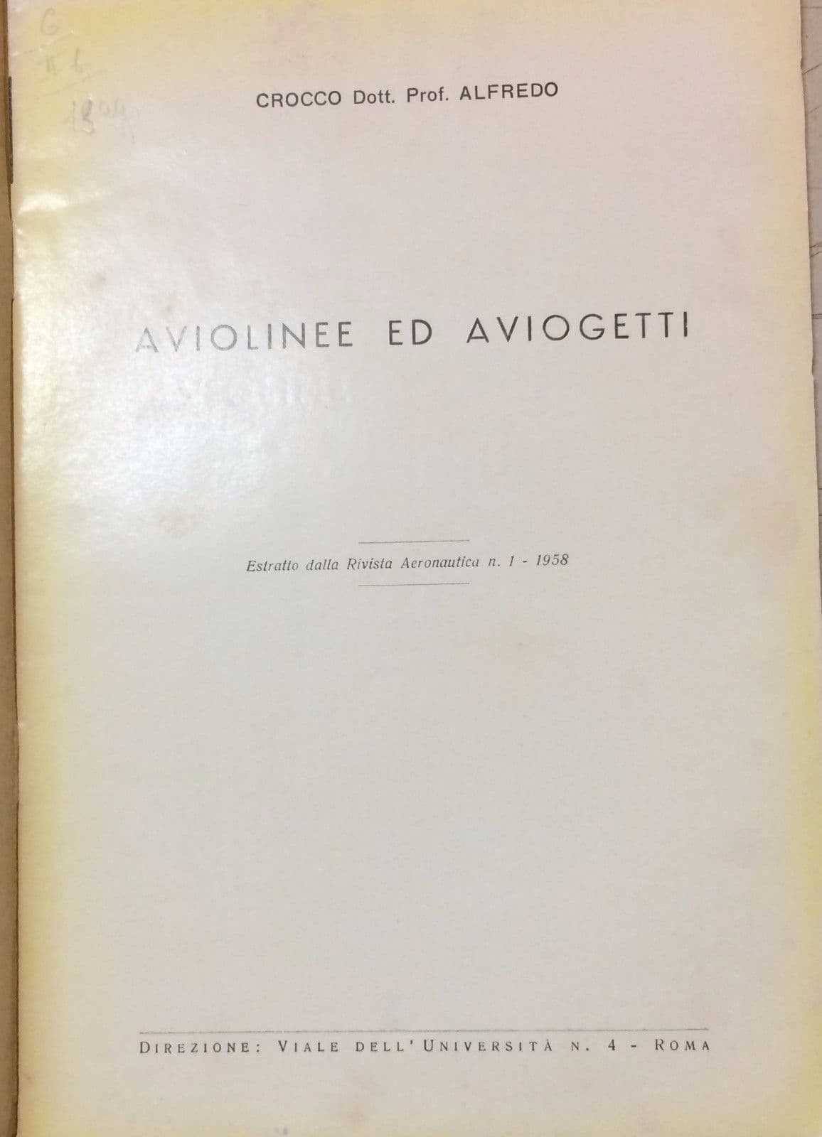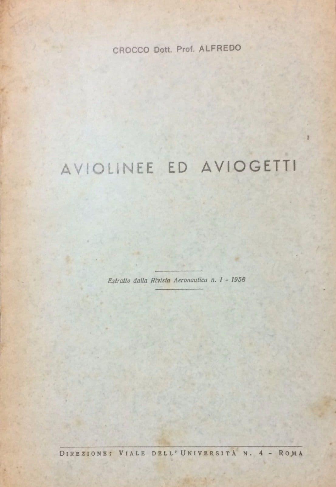 Alfredo Crocco Aviolinee ed aviogetti ... Roma, Rivista Aeronautica, 1958. Cm.24, pp.12, bross. edit. (difetti). Interessante edizione d'epoca, *pubblicazione con uno scritto di interesse aeronautico, all'epoca apparso nella citata Rivista Aeronautica, ma scritto che in origine era il testo di una relazione che l'autore tenne alla III Conferenza aeronautica italo-francese Leonardo da Vinci,* *con riferimenti alla aviazione a reazione, al potenziale di trasporto dei grandi quadrimotori, alla Convenzione di Chicago, ...* Di interesse specialistico, ingegneristico, economico, aeronautico, bibliografico Discreta conservazione generale, segni e difetti d'uso e d'epoca, usuali sparse fioriture e sgualciture e difetti vari marginali o così come visibili nelle immagini allegate; difetti vari alle copertine. *(le immagini allegate raffigurano particolari dell'intero volume, eventuali ulteriori informazioni a richiesta)*
