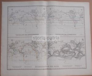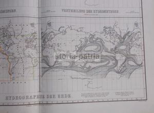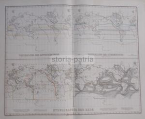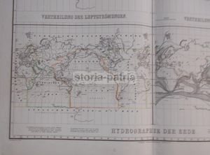 Edizione antica di grande formato raffigurante la superficie terrestre, con focus sui continenti europeo, asiatico e americano. La carta illustra dati idrografici complessi, incluse le correnti marine e i fenomeni meteorologici (Vertheilung der Luftstromunchen, Vertheilung der Hydrometeore).