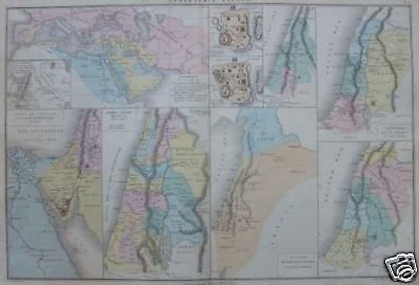 Interessante antica cartografia inerente i luoghi sacri della storia biblica, con varie raffigurazioni tra cui in alto a sinistra la mappa dei Paesi europei ed asiatici che videro la **Dispersione dei Figli di Noè** in essa è anche visibile l'Italia, la Grecia, e varia altri Paesi; in basso a sinistra è la **Terra di Canaan** con il percorso seguito dagli ebrei attraverso il deserto; in basso al centro è la cartografia della **Terra Santa** e il **Regno di David e Salomone** in basso a destra è un'altra cartografia della Palestina, all'epoca dopo la nascita di Gesù Cristo; in alto a destra è la Palestina sotto i Maccabei ed Erode; in alto al centro, il Regno di Giuda e Israele dopo lo Scisma, e ancora due piccole vedute topografiche di **Gerusalemme** avanti Cristo e dopo Cristo. *Bella mappa d'epoca, databile alla fine dell'800, incisione originale di Jenotte, impressa a Parigi da Brehier, con delicata coloritura d'epoca.* Cm. 33x47 circa (intero foglio, compresi i margini bianchi diseguali Di interesse culturale, storico, geografico, collezionistico Buona conservazione generale, segni o difetti d'uso e d'epoca, difetti marginali, piegatura centrale.