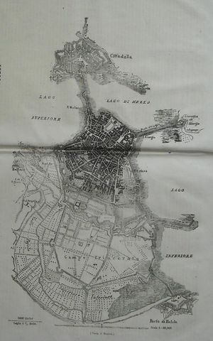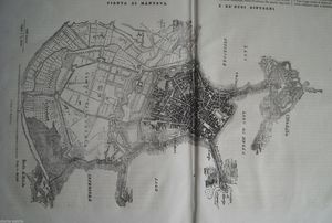Inusuale mappa topografica antica della città di Mantova e dei suoi dintorni, risalente al 1848.