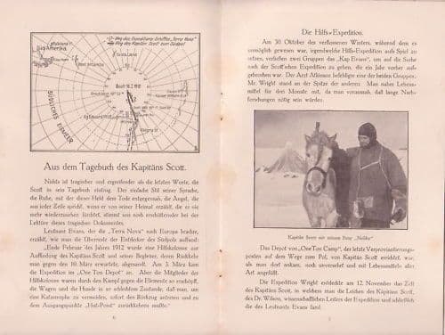 (GAUMONT) DIE LETZEN WEGE DES KAPITANS SCOTT *EWIGKEITS-DOKUMENTE VOM SUDPOL* Berlino, Gaumont ?, s.d. (primo '900) Cm.22,5; pp.16; bross. edit. figurata (sciupata) Interessante edizione antica e d'epoca, in lingua tedesca e pertanto di ardua sintesi per quanto riguarda la trattazione, ma probabilmente inerente la spedizione al Polo Sud del capitano Scott, *con in copertina un ritratto dello Scott in divisa militare fregiata di medaglie, e all'interno altre illustrazioni:* *il cap. Scott mentre mangia (in tenda ?) insieme a Evans, Bowers, il dr. Wilson;* *una mappa della zona polare con parte dell'America Meridionale e Capo Horn,...* *Scotto sulla neve insieme al suo pony Nobby* *una immagine fotografica con due che scalano un costone di ghiaccio (Eisberg)* *due esploratori su un cingolato* *altra immagine che vede il gruppo di esploratori nel desolato paesaggio ghiacciato;* DI INTERESSE SPECIALISTICO E BIBLIOGRAFICO Modesta conservazione generale, segni e difetti d'uso e d'epoca, diffuse fioriture, strappi e rotture alle copertine, eventualmente meritevole di rilegatura. *(l'immagine allegata raffigura un particola dell'interno della pubblicazione, eventuali altre informazioni a richiesta)*
