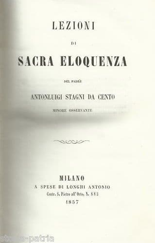 Antonluigi Stagni da Cento Lezioni di sacra eloquenza ... Milano, Longhi, 1857 Cm.16,5; pp. 384; senza legatura. Interessante edizione antica e d'epoca, bel volume dedicato all'arte oratoria, in particolare alla eloquenza sacra, della quale l'autore ferrarese esalta la sua indispensabilità, in una serie di "lezioni" o dissertazioni che esaminano *Diversi generi di eloquenza sacra* *Studio della Sacra Scrittura* *Studio dei SS. Padri* *Filosofia in aiuto alla eloquenza* *Della imitazione e cosa si debba imitare* *...* *Della predica, testo della predica, esordio, parti,...* *Storia e fatti storici* *Confutazioni, moralità, ...* *Generi di narrazione, mozione di affetti* *Predica catechistica, omelie, omelie sul Vangelo, panegirici,...* *Discorsi sopra i misteri* *Delle orazioni funebri* *...* *Dello stile, difetti di molti predicatori* *Le doti del predicatore, memoria, voce, enfasi, portamento* *....* Di interesse specialistico e bibliografico Buona conservazione generale, segni e difetti d'uso e d'epoca, sparse fioriture, esemplare senza legatura o copertine e pertanto meritevole di rilegatura.