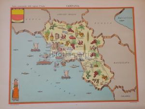Interessante e decorativa mappa geografica della regione Campania, pubblicata negli anni '50 dalle Edizioni Bolis di Bergamo. Si tratta di un'inusuale cartografia regionale a colori, parte della serie 'Carte economiche delle regioni d'Italia'.