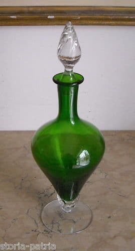 Decorativa ed elegante bella graziosa bottiglia, in vetro verde e con base in vetro chiaro trasparente, sinuosa ed elegante, ottimo soprammobile, molto decorativo, probabilmente esemplare prodotto da vetreria veneziana, forse Murano (?), *utilizzabile anche come vaso o semplice soprammobile o da vetrina, bella anche senza del tappo;* misura circa cm. 38 (altezza totale, compreso il tappo); databile presumibilmente alla metà del '900 (?) [https://img443.imageshack.us/img443/7296/bottiglia89a.jpg](https://img443.imageshack.us/img443/7296/bottiglia89a.jpg) [https://img404.imageshack.us/img404/646/bottiglia89f.jpg](https://img404.imageshack.us/img404/646/bottiglia89f.jpg) [https://img213.imageshack.us/img213/2254/bottiglie89b.jpg](https://img213.imageshack.us/img213/2254/bottiglie89b.jpg) [https://img121.imageshack.us/img121/2002/bottiglie89c.jpg](https://img121.imageshack.us/img121/2002/bottiglie89c.jpg) Decorativa e da collezione Buona conservazione generale, usuali segni e difetti d'uso e d'epoca. *(le immagini allegate mostrano l'oggetto sia col tappo sia senza tappo)*[](https://img443.imageshack.us/i/bottiglia89a.jpg/) [](https://img404.imageshack.us/i/bottiglia89f.jpg/) [](https://img213.imageshack.us/i/bottiglie89b.jpg/) [](https://img121.imageshack.us/i/bottiglie89c.jpg/)