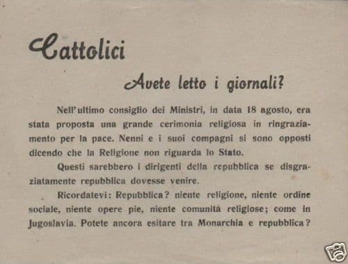 Rarissimo antico foglio volante Originale d'epoca diretto ai **cattolici** italiani, in occasione dell'imminente celebre referendum tra Monarchia e Repubblica, a fine di dissuasione dal votare la **Repubblica** e di conservare quindi il regime monarchico in vigore scoraggiando i cattolici per le ostilità che sarebbero emerse nei loro confronti ad opera dei comunisti o repubblicani, per la loro presunta avversione contro la Chiesa e la Religione, riferendo anche un recente episodio in cui *".....Nenni e i suoi compagni si sono opposti (a una cerimonia religiosa) dicendo che la religione non riguarda lo Stato...come in Jugoslavia. Potete ancora esitare tra Monarchia e Repubblica?"* Bel documento originale, di grande interesse storico politico e collezionistico probabilmente unico superstite poiché spesso tali volantini venivano facilmente distrutti. Misura cm.13x17; bella conservazione generale, stampa al recto, verso bianco; **meritevole di essere inserito sotto passpartout ed incorniciato.**