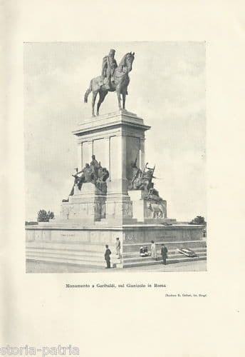 Monumento a Garibaldi *Sul Gianicolo in Roma* Interessante antica stampa raffigurante il grande monumento equestre a Garibaldi, con anche altri gruppi raffiguranti episodi della vita o di momenti storici dei garibaldini, *opera d'arte dello scultore E. Gallori, eretta sul Gianicolo, a Roma;* misura circa cm. 29x20 (l'intero foglio, a margini bianchi diseguali); esemplare edito probabilmente come tavola illustrativa di un'opera di interesse storico celebrativo del primo '900 (1907 ?); illustrazione fotografica da una foto Brogi. Di interesse artistico risorgimentale collezionistico Buona conservazione generale, usuali segni o difetti d'uso e d'epoca, ***stampa meritevole di essere inserita sotto passpartout ed incorniciata*.** *(l'immagine allegata raffigura un particolare dell'intero foglio, eventuali altre informazioni a richiesta)*
